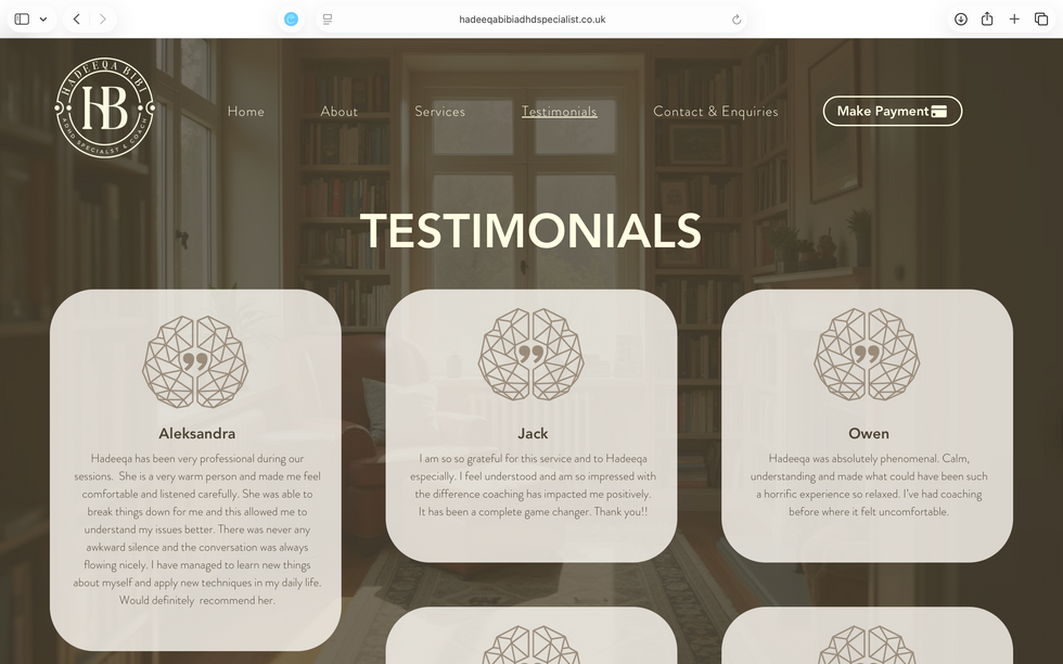 This project began with an in-depth exploration of Hadeeqa’s mission, values and target audience. The aim was to develop a brand and online presence that reflects her supportive, empowering and professional approach to ADHD coaching. From the logo design and visual identity through to the structure and layout of the website, every element was carefully crafted to ensure clarity, trust and impact.